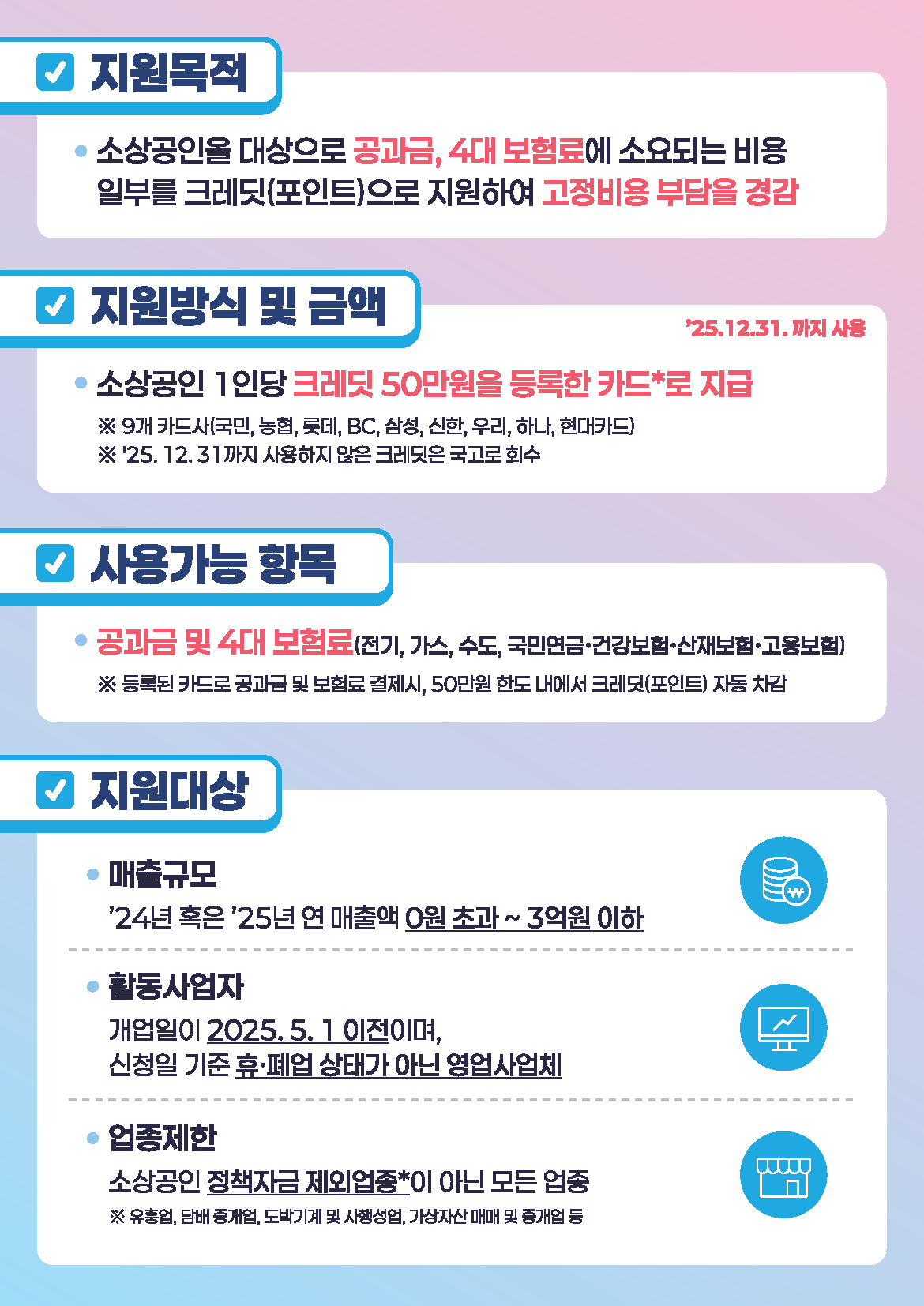 연 매출 3억 원 이하 소상공인은 50만 원 크레딧을 통해 공과금 및 보험료 부담을 덜 수 있는 절호의 기회! 부담경감크레딧.kr에서 신청하세요!